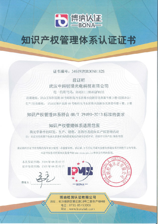 熱烈祝賀武漢中科銳擇光電科技有限公司于2019年9月獲得知識(shí)產(chǎn)權(quán)貫標(biāo)認(rèn)證證書,這意味著中科銳澤在知識(shí)產(chǎn)權(quán)領(lǐng)域獲得到重要認(rèn)可,在知識(shí)產(chǎn)權(quán)方面得到進(jìn)一步規(guī)范和在綜合競(jìng)爭(zhēng)力得到進(jìn)一步提升。